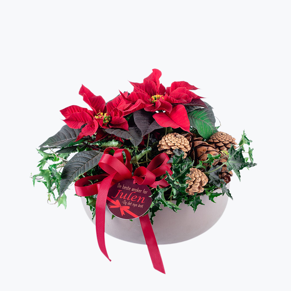 Fin og holdbar sammenplantning som er pyntet til julehøytiden. Inneholder klassikerne rød julestjerne, grønn eføy, kongler og sløyfe. Planteskålen er pen og diskret, passer inn i et hvert hjem.
